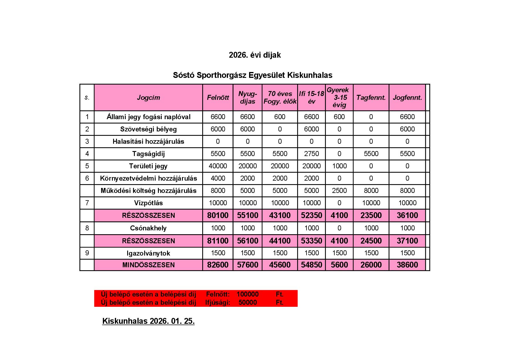 Napijegy ára 2026 -ben : Ifjúsági 3500 Ft / 1 db nemes hal a Helyi horgászrend mérethatárain belül /